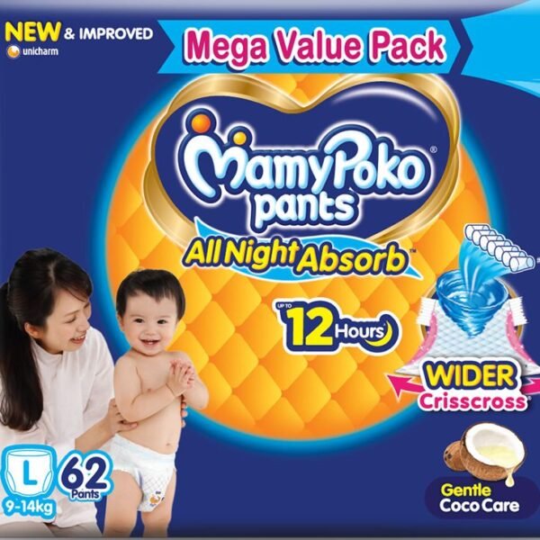 MamyPoko Pants All Night Absorb,Coco Care & 12hr Leakage Protection – L (62 Pieces)