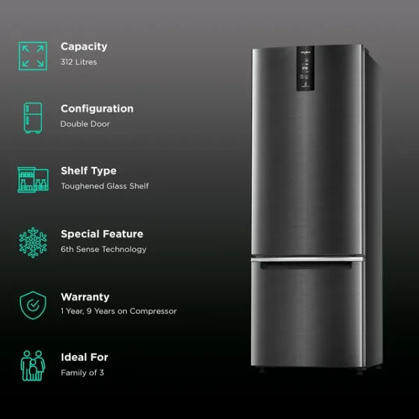 Whirlpool Intellifresh Pro 370 312 Litres 3 Star Frost Free Double Door Bottom Mount Convertible Refrigerator with 6th Sense Technology (Steel Onyx)