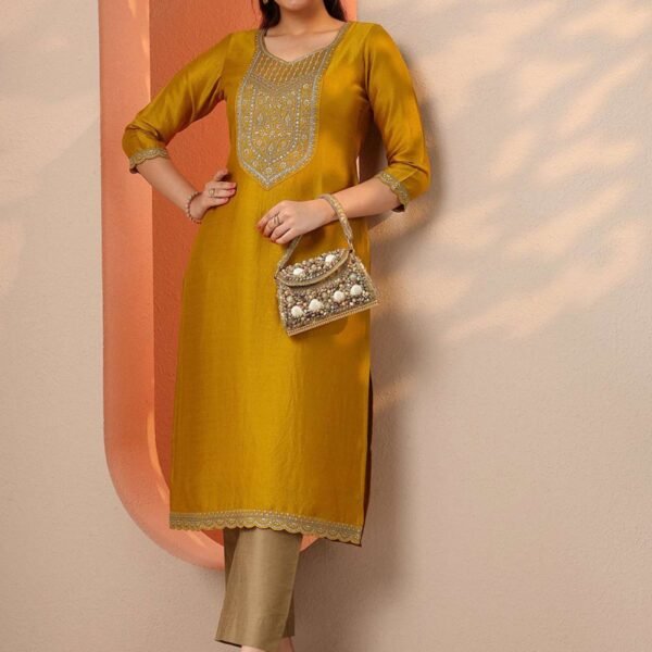 Klikniz Women's Mustard Yellow Embroidered Art Silk Kurta