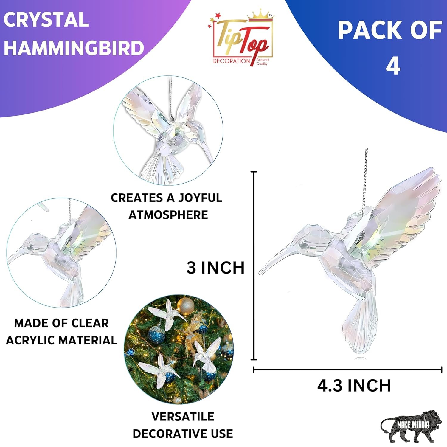 Premium 3D Clear Crystal Acrylic Iridescent Pigeon Dove Hummingbird Hanging Suncatcher (Hummingbird, Pack of 4 Pieces)(AA1103/82)