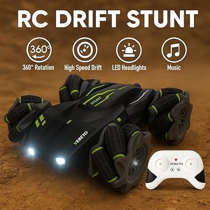 • DOUBLE-SIDED STUNT ACTION: Powered by a high-performance 4-wheel drive system and high-traction tyres, this RC car delivers thrilling 360-degree flips, drifts, slides, spins, rolls, and extreme stunts. Its double-sided driving design lets it race on both sides for nonstop fun and jaw-dropping tricks.