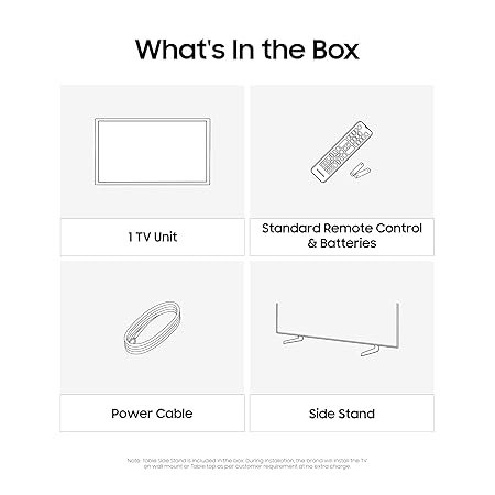 | Included Components | 1 Number LED TV, 1 Number POWER CORD, 2 Numbers BATTERY (AAA Size), 1 Number REMOCON, 1 Number STAND P-COVER TOP1 Number LED TV, 1 Number POWER CORD, 2 Numbers BATTERY (AAA Size), 1 Number REMOCON, 1 Number STAND P-COVER TOP |