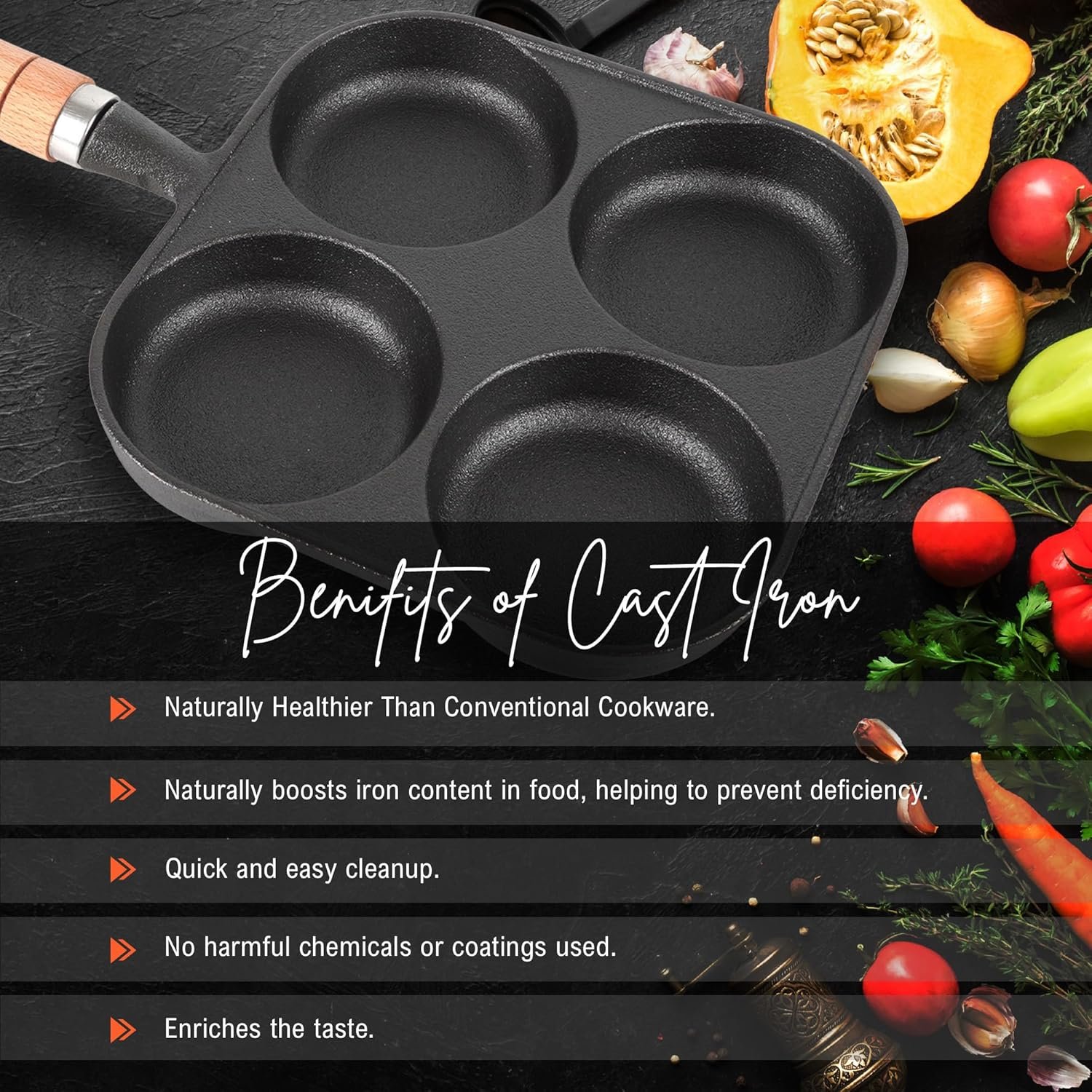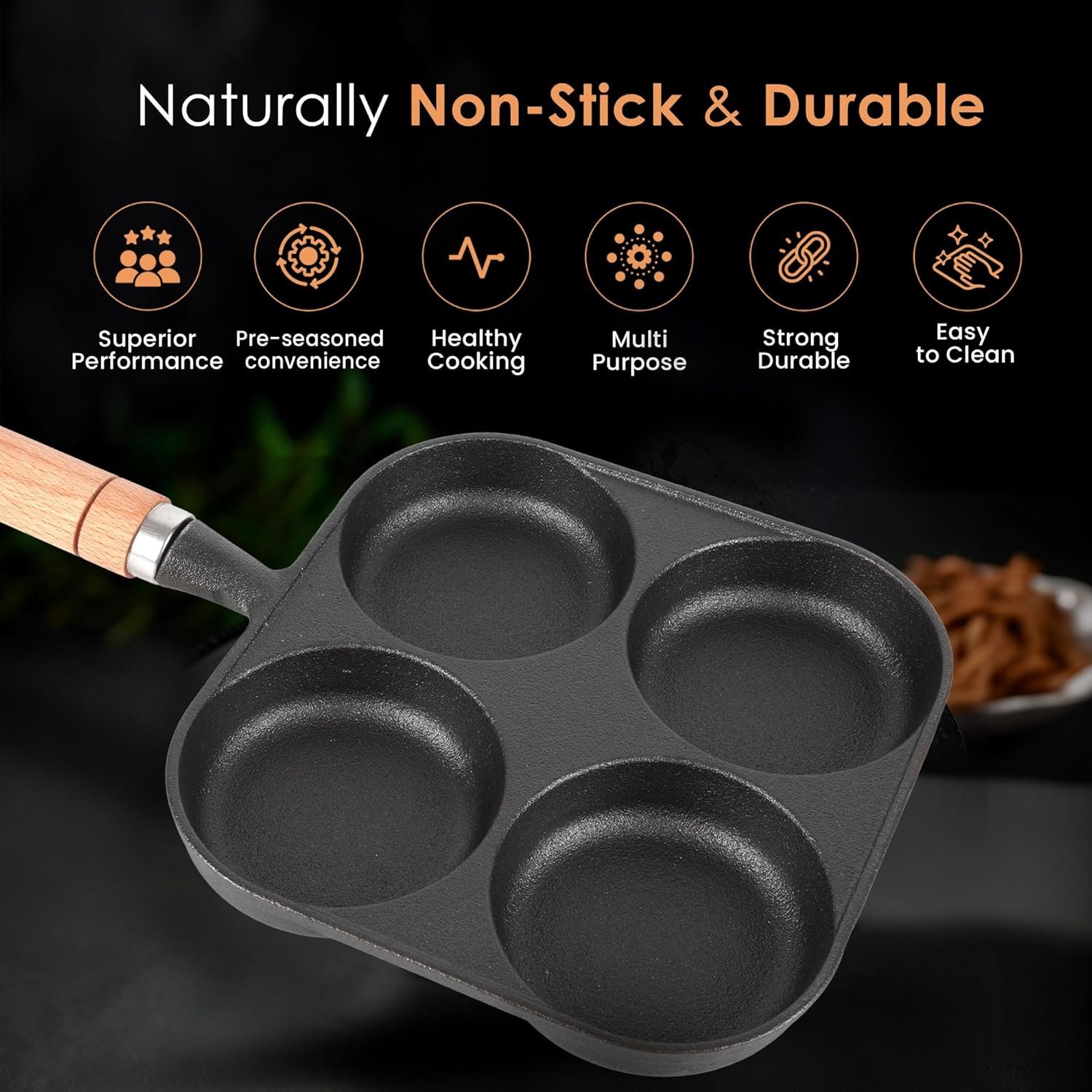 SOLARA Crownstone Premium Pre-Seasoned Cast Iron Uttapam Pan, 4 Pit, Pancake Pan,Induction Friendly, Naturally Nonstick, 100% Pure & Toxin-Free Uttappam Tawa with Wooden Handle(AA1103/40)