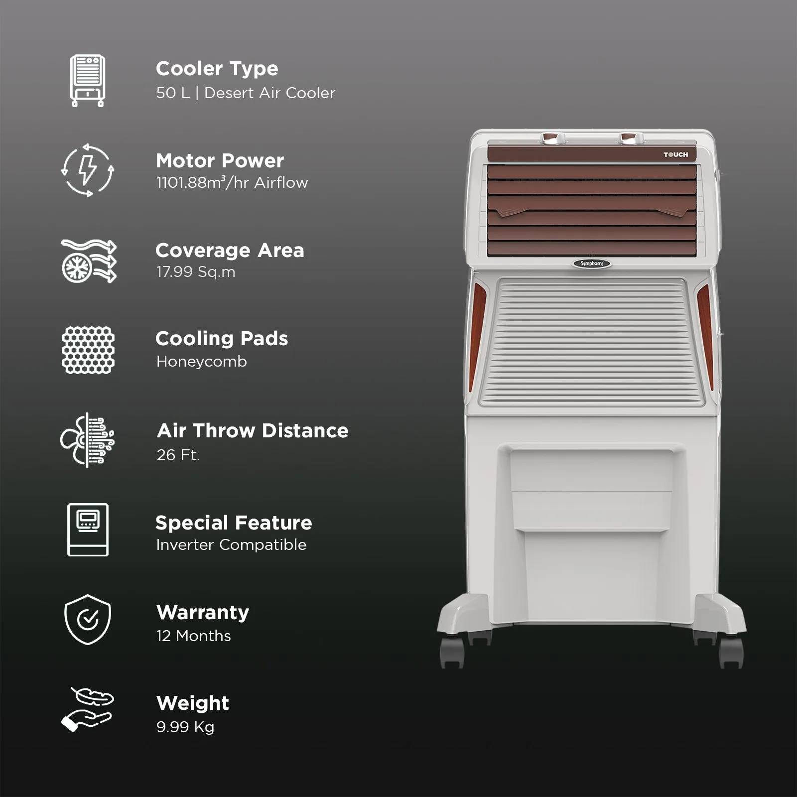 Symphony Touch 50 Litres Desert Air Cooler with Fully Closable Louvers (CFD Technology, White)