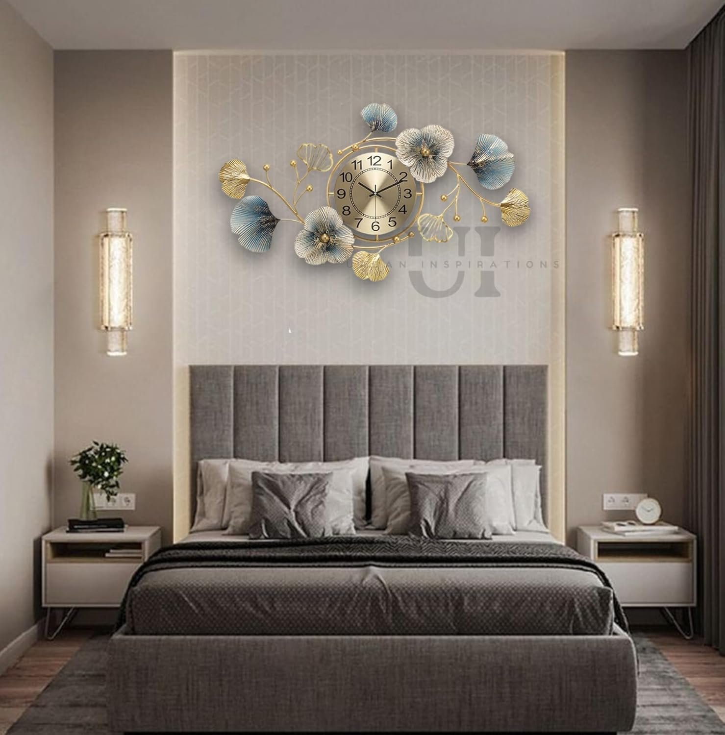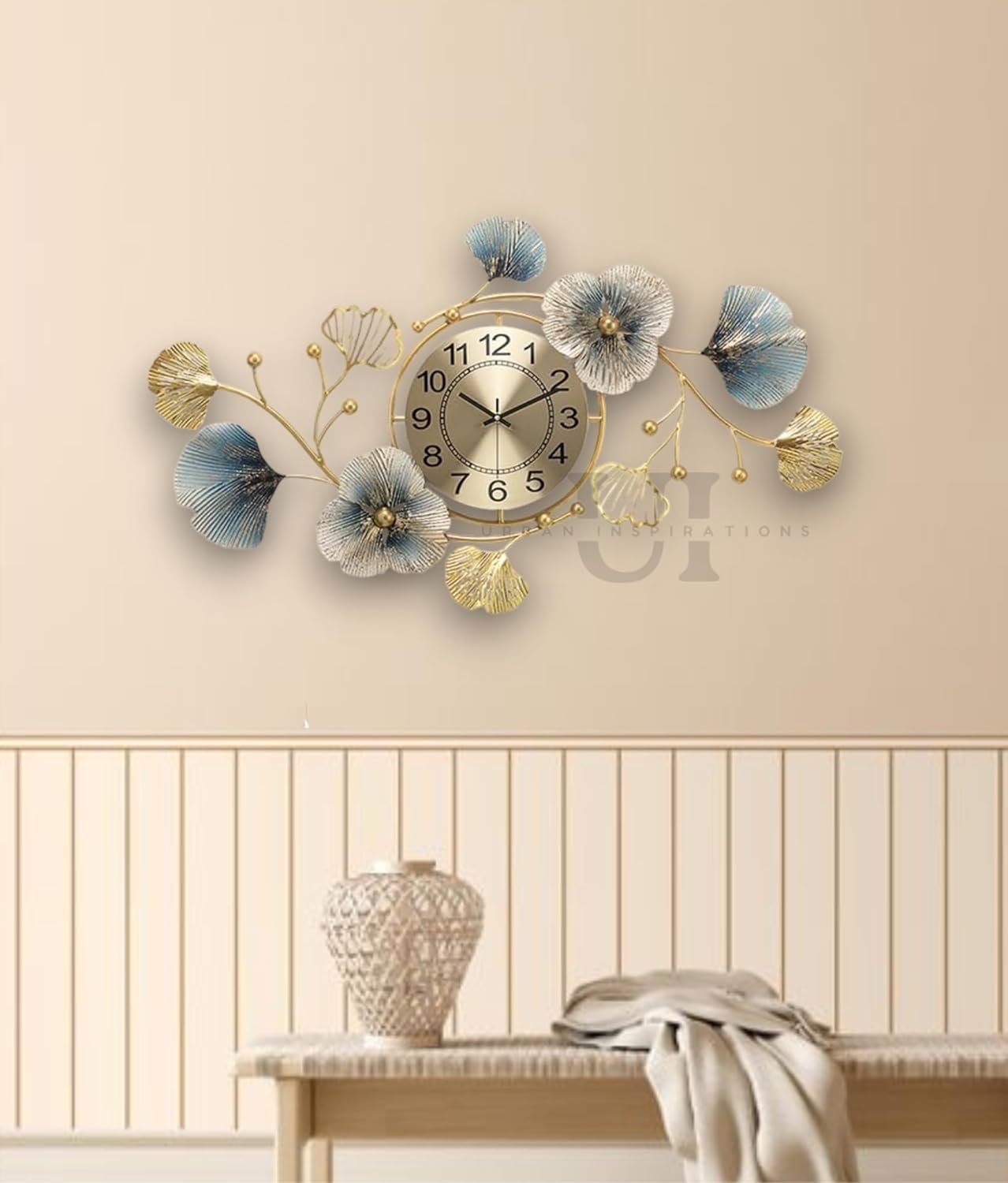Large Metal Wall Clock for Living Room Décor | Luxury Golden & Blue Ginkgo Leaf Design | Modern Silent Non-Ticking Wall Watch | Premium Decorative Wall Art Clock (70 x 39 cm)(AA1103/184)