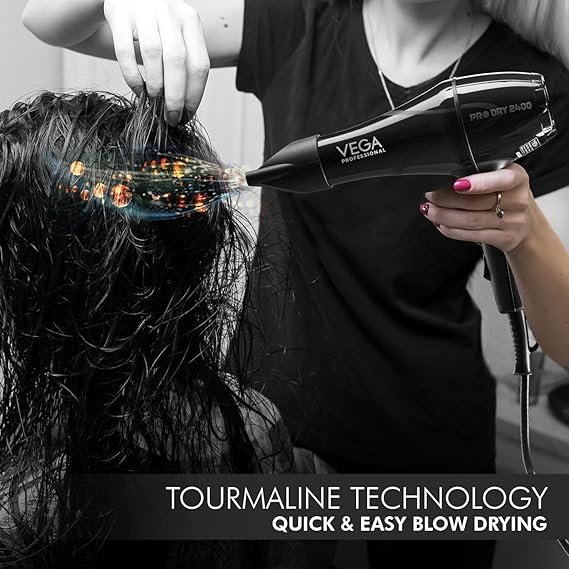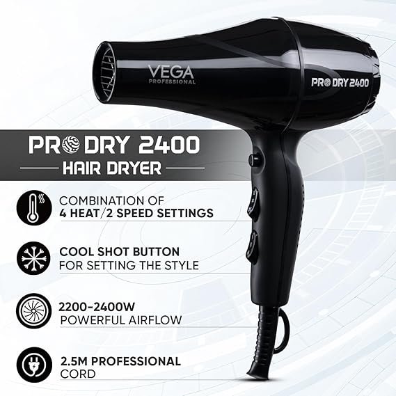 VEGA PROFESSIONAL Pro Dry 2400W Hair Dryer for Salon Professionals and Styling at Home | Cool Shot Button and Combination of 4 Heat & 2 Speed Settings, Black, (VPMHD-03) (AA1104/51)