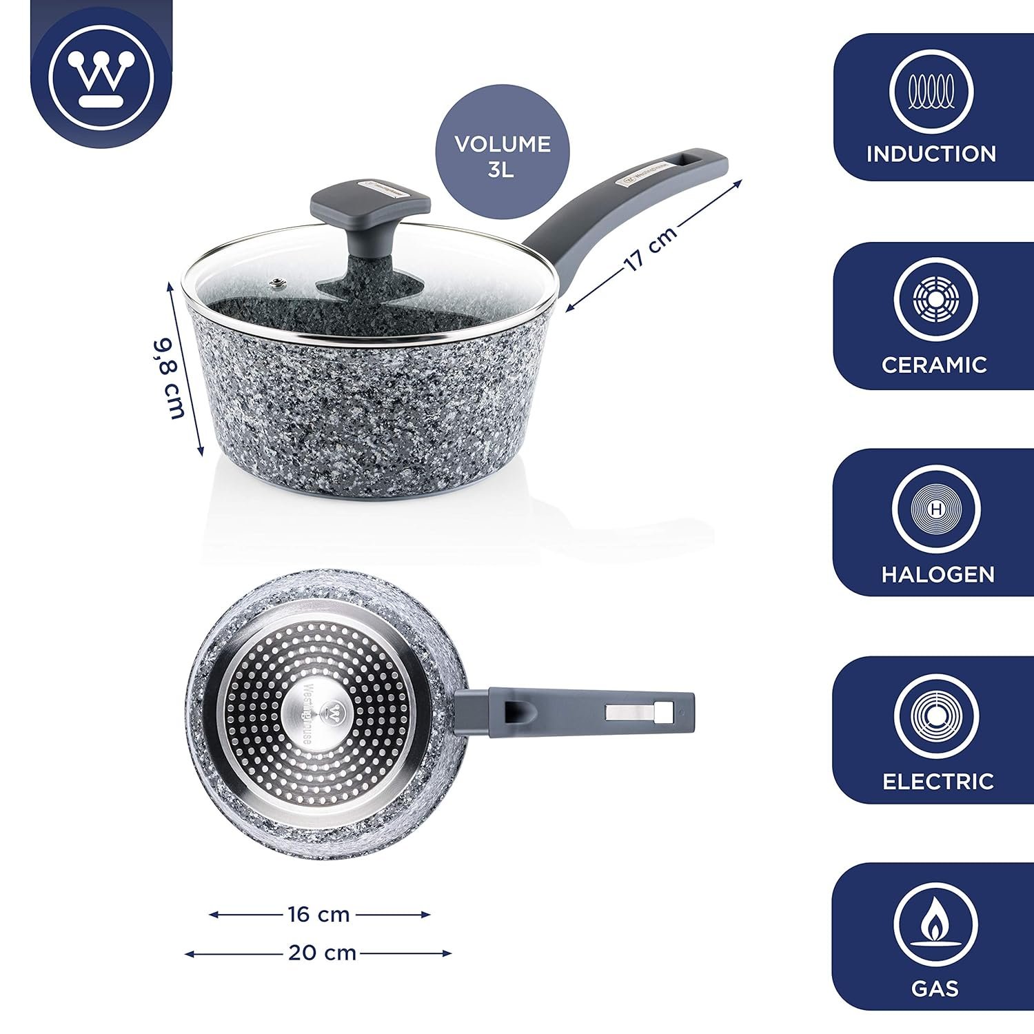 Be the first to review “Westinghouse Granite Series Non Stick Saucepan with Lid – 20 cm Saute Pan for Induction Gas Electric & Ceramic Hob | Grey Granite, 2.5L, 2.5 Liter(AA1103/99)”