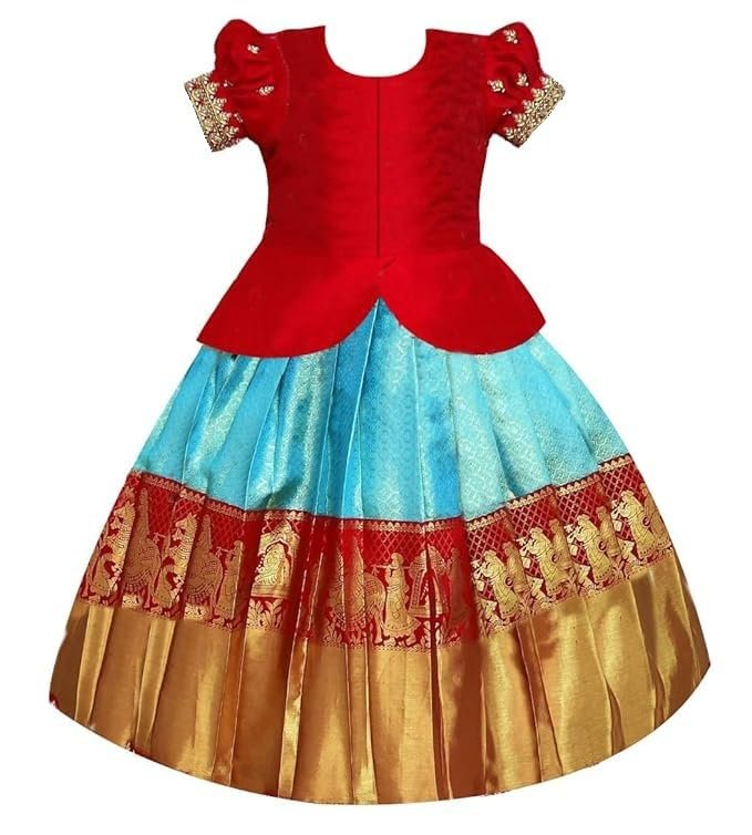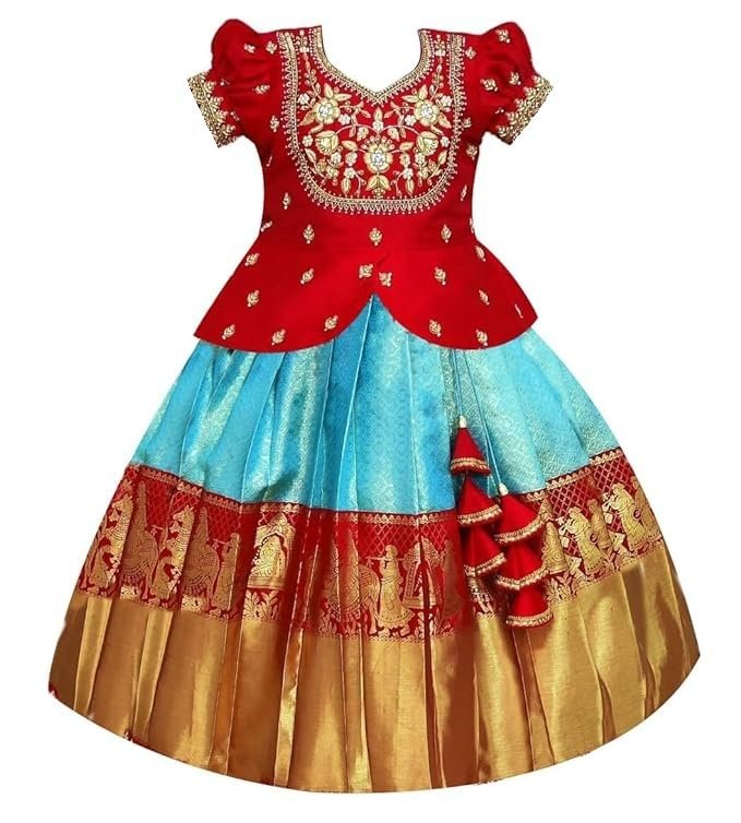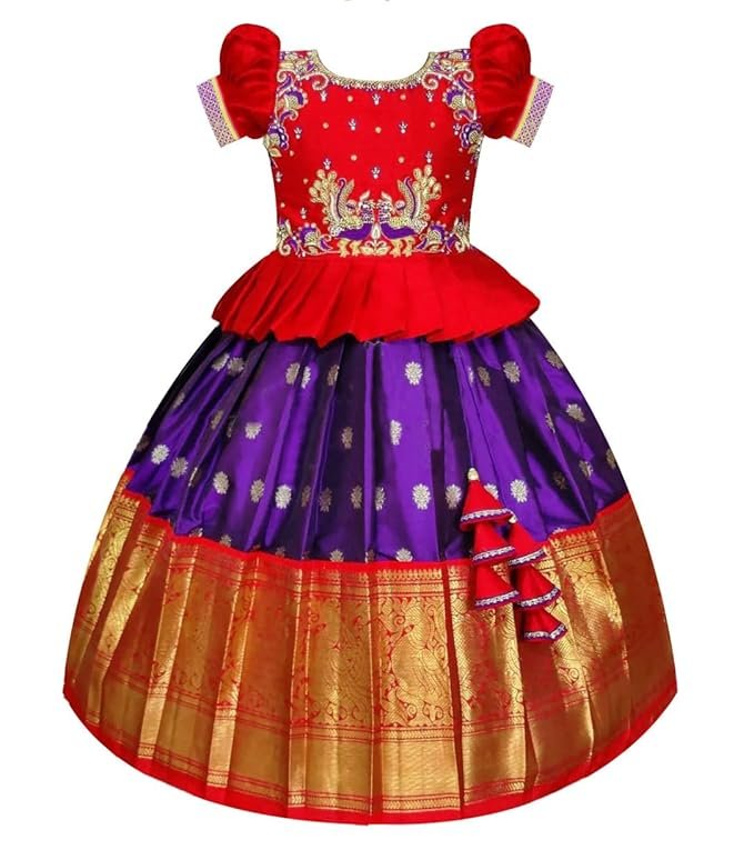• Ready-to-wear design: Stylish girls’ party wear pattu pavadai (Lehenga Choli) crafted for convenience and elegance.