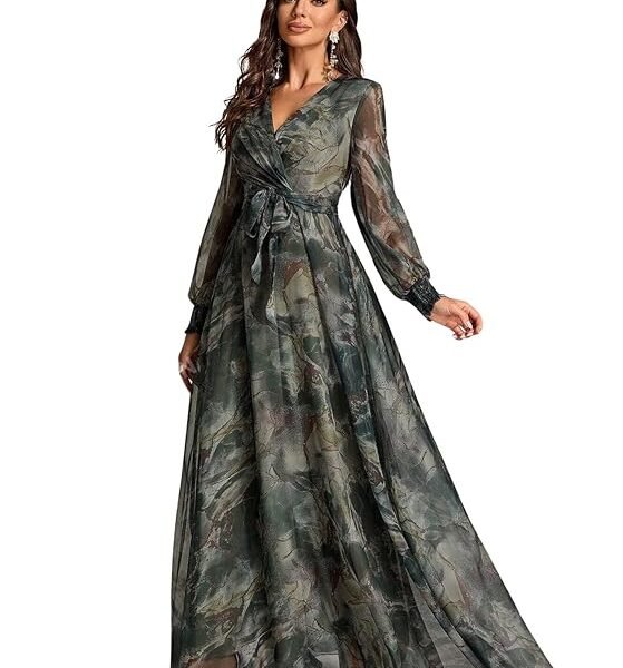 LITZO Dress for Women || Women’s Printed Wrap Maxi Gown || V‑Neck Long Sleeve Belted Flowy Dress for Parties, Weddings & Evening Events || Lightweight Sheer Layer Western Outfit (T-L-14-16)